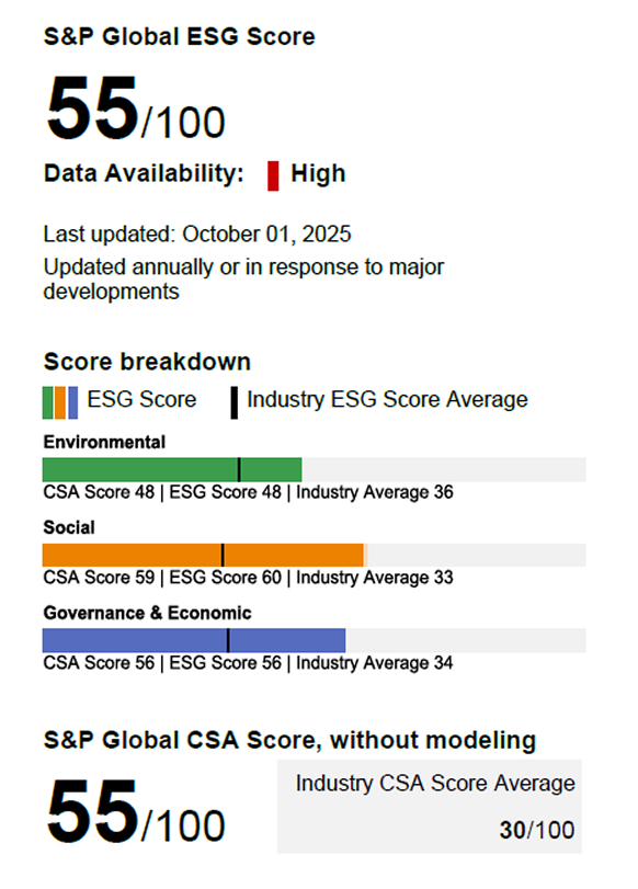 在標普全球( S&P Global)評級體系中, 2025年度綜合得分為55分
